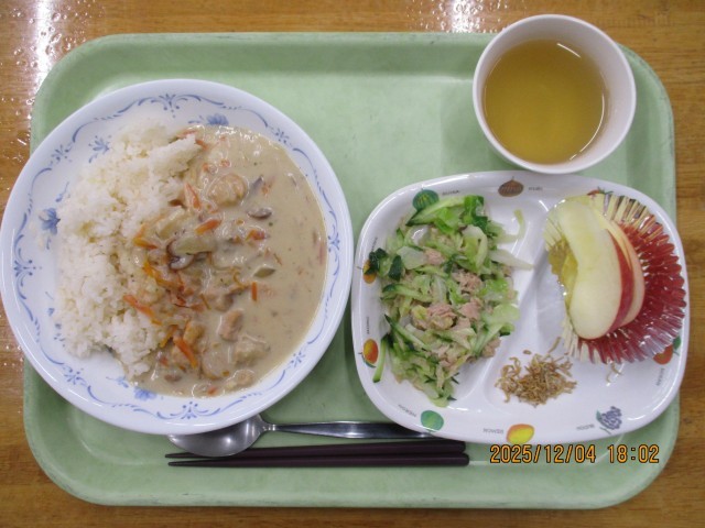 12月4日(木)おやつ~12月5日(金)昼食 公開日 2025/12/08 更新日 2025/12/08 昼食のご紹介 12月4日(木)おやつビスケット、牛乳12月4日(木)夕食パプリカライスクリームソース、ツナサラダ、白菜ミルクスープ、あまじゃっこ、りんご12月5日(金)朝食ごはん、みそ汁、鶏肉のかおり焼き、切り干しに、ゆかりあえ12月5日(金)昼食焼きそば、牛乳、春雨サラダ、フルーツ白玉写真はおやつ・夕・朝の順です。
