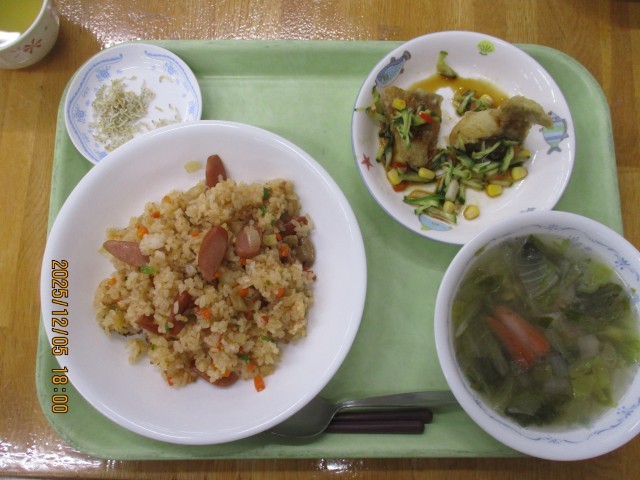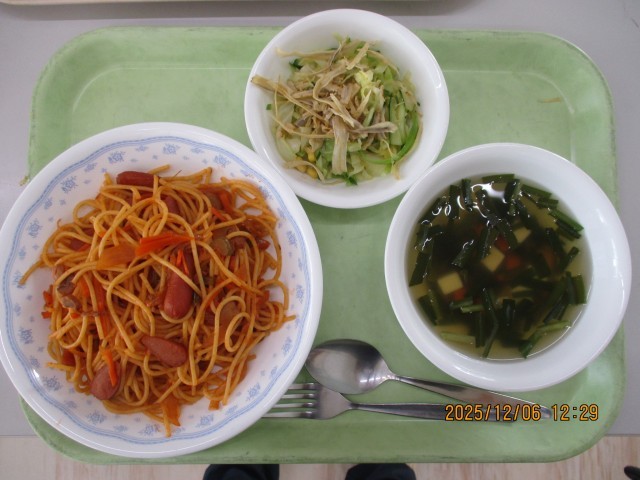 ナポリタン、牛乳、豆腐のスープ、ごぼうのパリパリサラダ