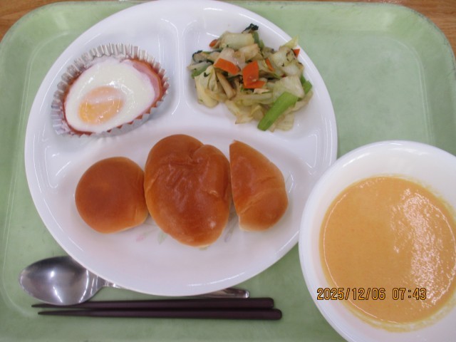 クリームパン、バターロール、ハムエッグ、にんじんポタージュ、野菜いため