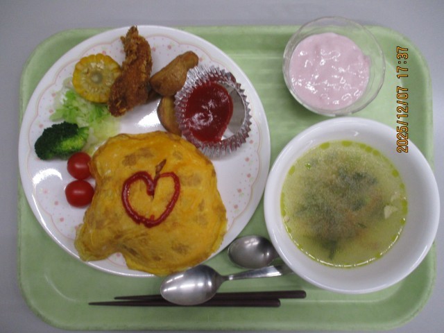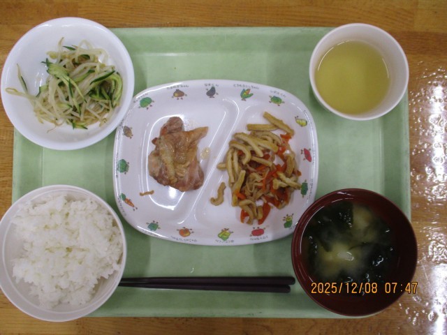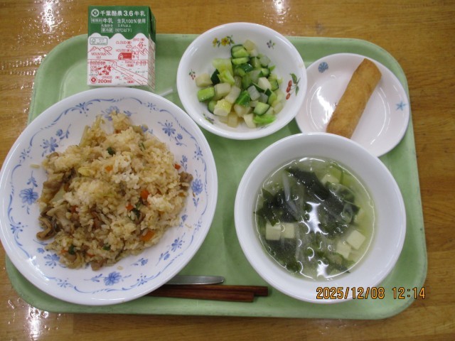 12月7日(日)おやつ~12月8日(月)昼食 公開日 2025/12/08 更新日 2025/12/08 昼食のご紹介 12月7日(日)おやつチョコロールケーキ、ヤクルト12月7日(日)夕食キラキラバースデー12月8日(月)朝食ごはん、みそ汁、鶏のてり焼き、切り干しに、もやしのナムル12月8日(月)昼食キムチチャーハン、牛乳、わかめスープ、大根サラダ、りんごの春巻きパイ写真はおやつ・夕・朝・昼の順です。 +1