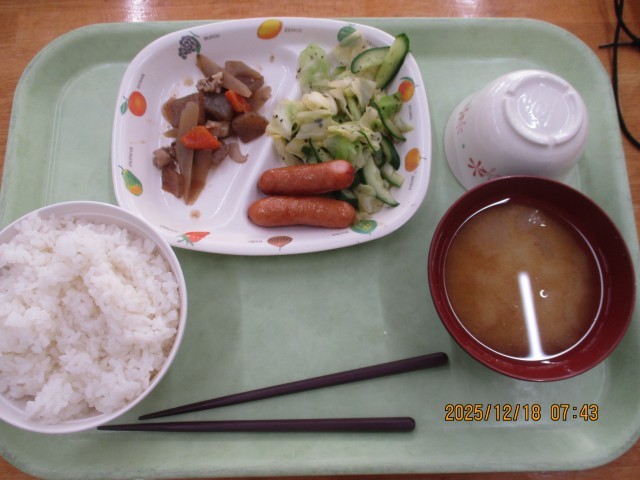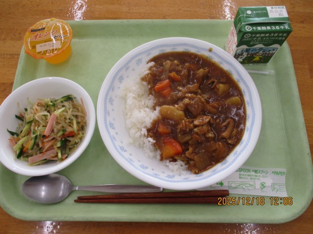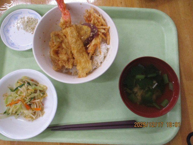 12月17日(水)おやつ~12月18日(木)昼食 公開日 2025/12/18 更新日 2025/12/18 昼食のご紹介 12月17日(水)おやつマドレーヌ、ミルクティー12月17日(水)夕食天丼、すまし汁、和風サラダ、あまじゃっこ12月18日(木)朝食ごはん、みそ汁、ボイルウインナー、豚肉とごぼうに、ゆかりあえ12月18日(木)昼食カレーライス、牛乳、中華サラダ、フルーツゼリー写真はおやつ・夕・朝・昼の順です。 +1