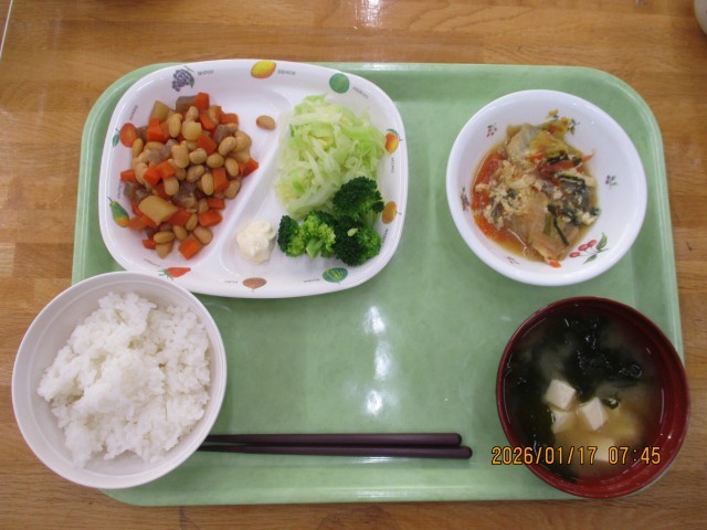 ごはん、みそ汁、たまごとじに、五目に豆、ボイル野菜