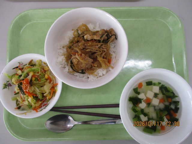 プルコギ丼、牛乳、海藻サラダ、豆腐のスープ