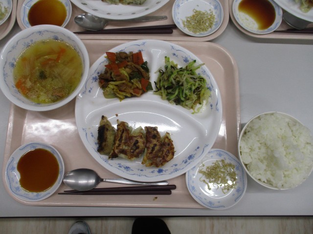 ごはん、白菜スープ、焼きギョーザ、ホイコーロー、昆布サラダ、あまじゃっこ