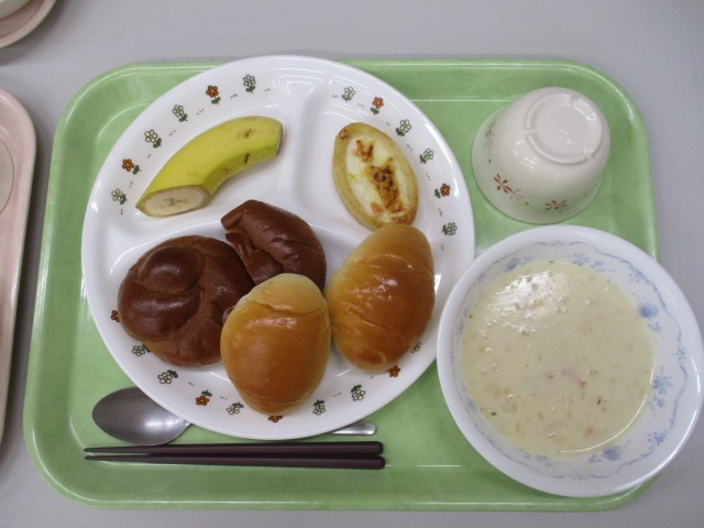 黒糖ロールパン、バターロール、コーンスープ、ポテトグラタン、バナナ