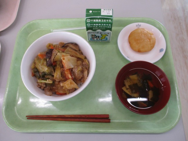 ホイコーロー丼、牛乳、わかめ汁、ポテトもち