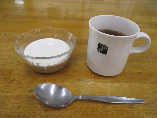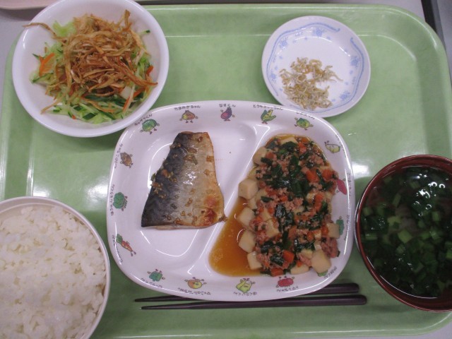 ごはん、すまし汁、さばの韓国焼き、豆腐のあんかけ、ごぼうのパリパリサラダ、あまじゃっこ