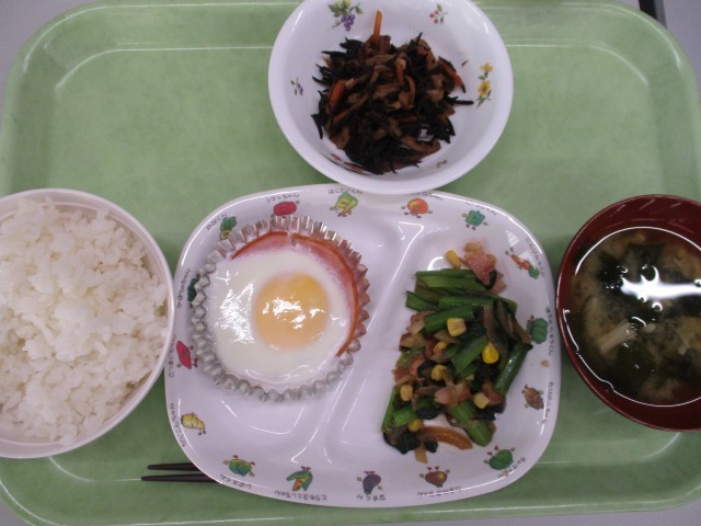 ごはん、みそ汁、ハムエッグ、ひじきに、小松菜ソテー