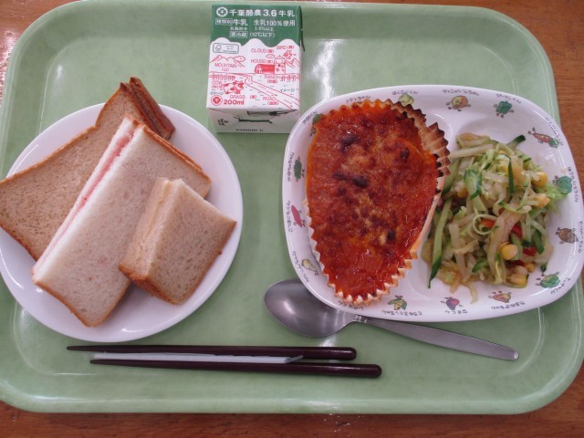 二食サンド、牛乳、ポテトのミートソースグラタン、コーンサラダ