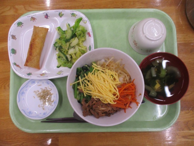 ビビンバ、わかめスープ、かぼちゃの春巻き、ゆかりあえ、あまじゃっこ
