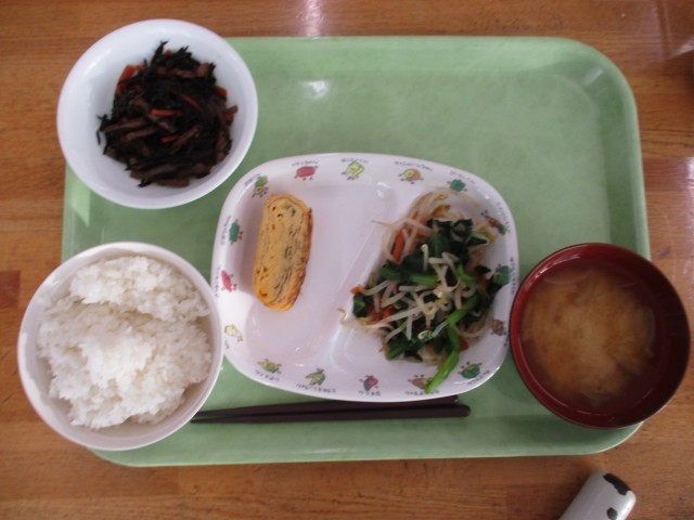 ごはん、みそ汁、あつ焼きたまご、ひじきに、小松菜おひたし