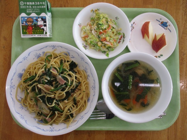 ほうれん草の和風パスタ、牛乳、野菜スープ、コールスローサラダ、りんご