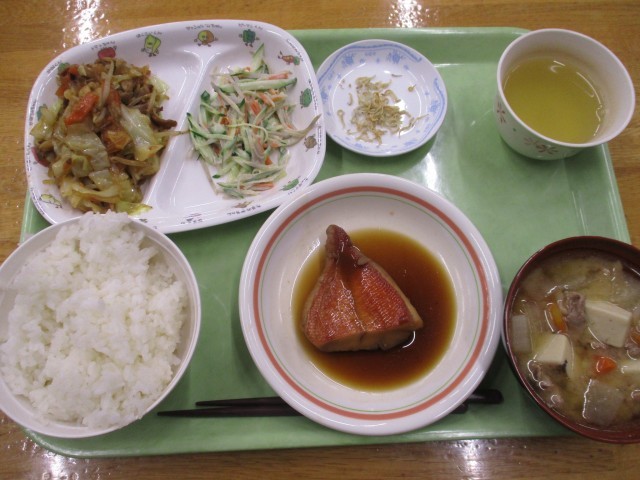 ごはん、豚汁、に魚、春雨入り野菜炒め、ごぼうサラダ、あまじゃっこ