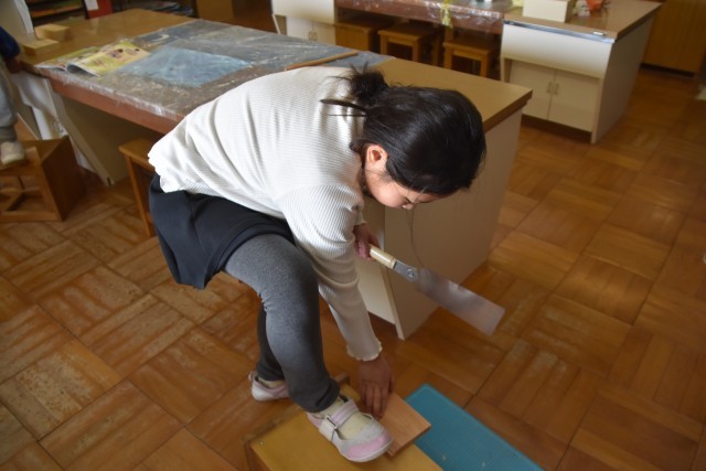 5時間目の図工の時間に、のこぎりを使った学習をしました。道具の扱いに慣れないながらも、安全面に気を付けながら、楽しく木材を切ることができました。