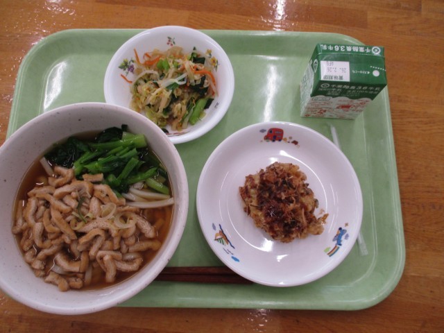 きつねうどん、牛乳、たこぺったん、切り干しのナムル