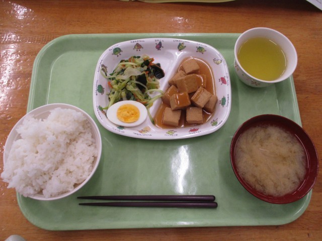 ごはん、みそ汁、生揚げにあんかけ、ゆでたまご、わかめサラダ
