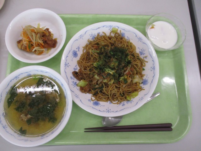 焼きそば、牛乳、野菜スープ、鶏のなんばんづけ、ヨーグルトあえ