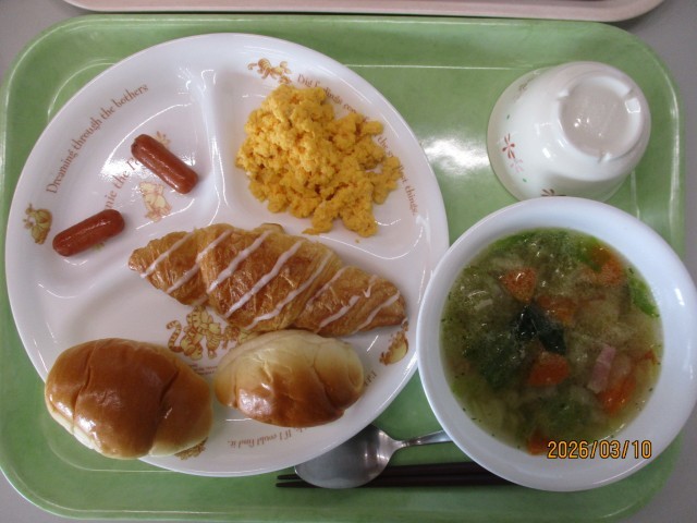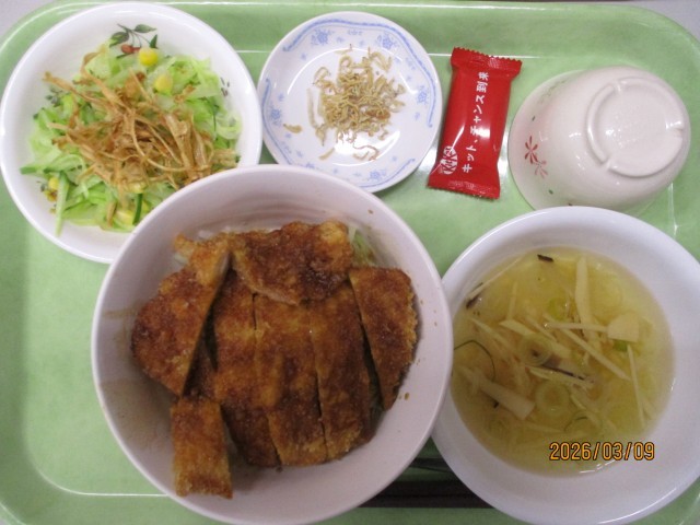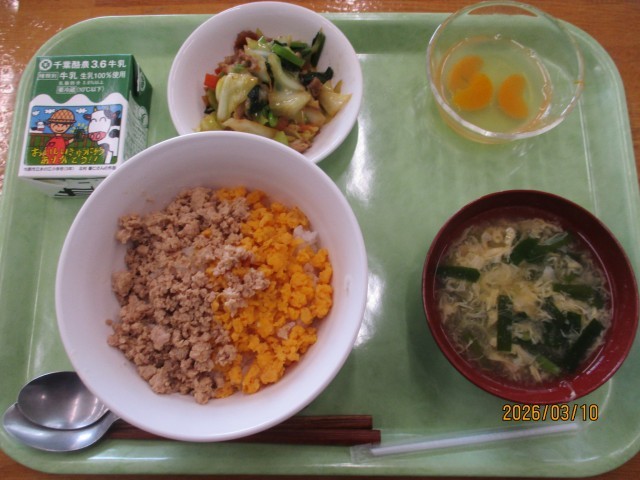 3月9日(月)おやつ~3月10日(火)昼食 公開日 2026/03/10 更新日 2026/03/10 昼食のご紹介 3月9日(月)おやつ豆乳ミルクプリン、紅茶3月9日(月)夕食駅伝応援メニューソースカツ丼、春雨スープ、ごぼうのパリパリサラダ、あまじゃっこ、キットカット3月10日(火)朝食バターロール、シュガーロール、野菜スープ、スクランブルエッグ、ウインナー3月10日(火)昼食鶏そぼろ丼、牛乳、かき玉汁、豚と野菜ソテー、りんごゼリー写真はおやつ・夕・朝・昼の順です。 +1