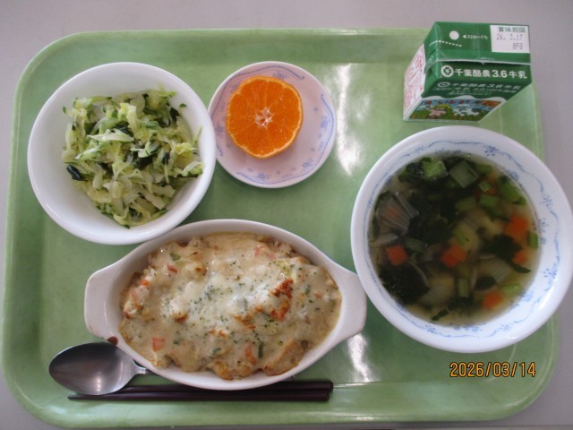 エビドリア、牛乳、芋と野菜スープ、わかめサラダ、みかん