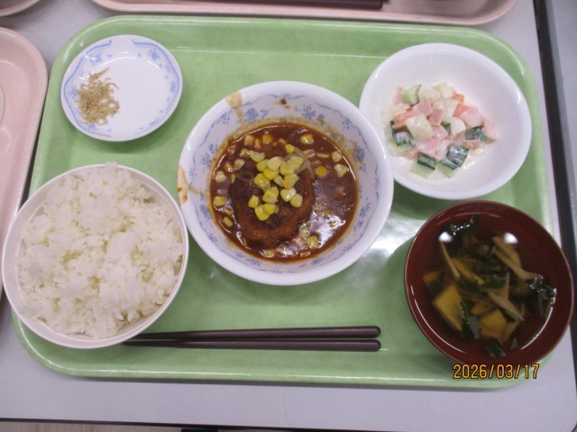 ごはん、すまし汁、にこみハンバーグ、マセドアンサラダ、コーンソテー、あまじゃっこ