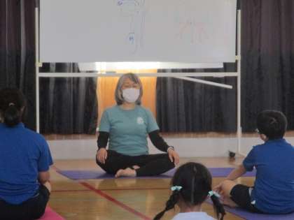 平賀先生をお招きして、天津ヨガの指導をしていただきました。天津ヨガは、朝の自立活動でも行っていて、日常的に取り入れています。さらに健康的な呼吸法も教えていただきました。