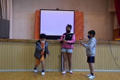 学級委員会が中心となって、年に1回行われる集会です。希望者が自分のかくし芸を披露しました。クイズ、けん玉、イラスト紹介、負けないじゃんけん、なわとび挑戦、お笑い団体芸、ダンスとそれぞれ多方面の才能を見せてくれました。先生たちも参加しました。