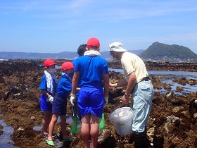 子どもたちはワクワクしながら磯場へ行き、夢中で生き物を見つけていました。