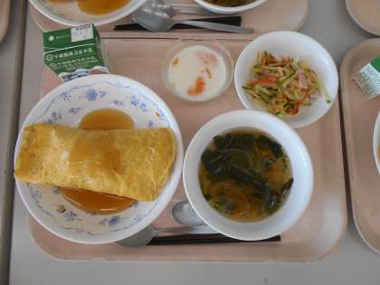 12月19日(月) 公開日 2022/12/19 更新日 2022/12/19 昼食のご紹介 中華風オムライス、ほうれん草スープ、大根サラダ、 ミルクゼリー、牛乳 今日の中華風オムライスは調理員さんが薄焼き卵を 一枚一枚丁寧に包んでくれました。