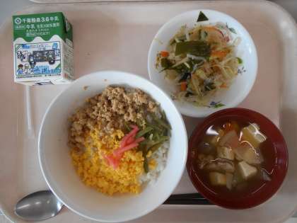 とりそぼろ丼、牛乳、けんちん汁、糸寒天のサラダ