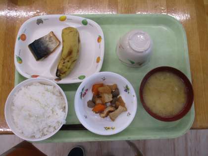 ごはん、みそ汁、鯖の文化干し、生揚げと野菜煮、バナナ