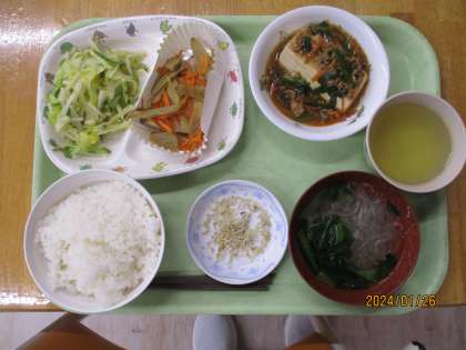 1月26日(金)夕食〜1月27日(土)昼食 公開日 2024/01/29 更新日 2024/01/29 昼食のご紹介 1月26日(金)夕食 ごはん、すまし汁、さばのごぼう味噌焼き、豆腐のあんかけ、和風サラダ、あまじゃっこ 1月27日(土)朝食 ごはん、みそ汁、鮭の塩焼き、野菜炒め、納豆 1月27日(土)昼食 牛乳、カレーライス、イタリアンサラダ、オレンジ 夕 朝 昼