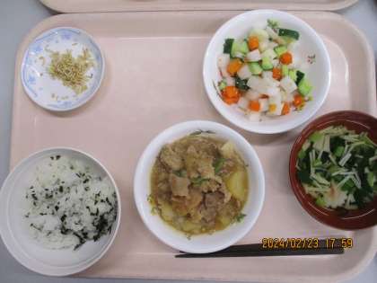 2月23日(金)夕食〜2月24日(土)昼食 公開日 2024/02/26 更新日 2024/02/26 昼食のご紹介 2月23日(金)夕食 わかめごはん、すまし汁、肉じゃが、大根サラダ、あまじゃっこ 2月24日(土)朝食 ごはん、みそ汁、卵の千草焼き、野菜と豚肉のソテー、海苔の佃煮、はっさく 2月24日(土)昼食 牛乳、あぶたま丼、けんちん汁、和風きのこサラダ、りんご 夕 朝 昼