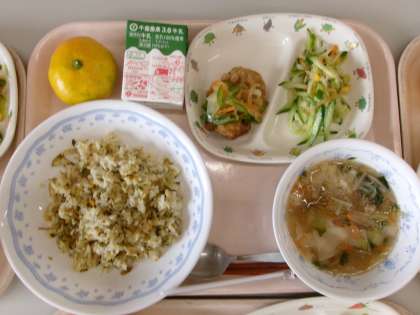 高菜とじゃこのチャーハン、牛乳、鶏の南蛮酢かけ、ワンタンスープ、フレンチサラダ、みかん