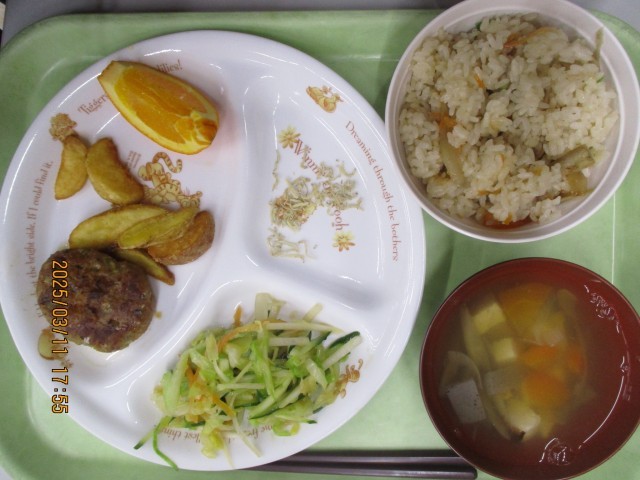 かやくごはん、けんちん汁、魚のさんがやき、和風サラダ、フレンチポテト、あまじゃっこ、オレンジ