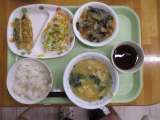 10月8日(日)夕食 ごはん、麻婆なす、魚の磯辺揚げ、和風サラダ、中華コーンスー...