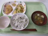 10月13日(金)夕食 ゆかりご飯、けんちん汁、鶏の竜田揚げおろしあん、和風サラ...