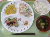 8月30日(水)夕食 ごはん、利休汁、魚のさんがやき、フレンチポテト、小松菜とじ...