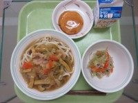 【本日の献立】かけカレーうどん・野菜の甘酢和え・いももち・牛乳