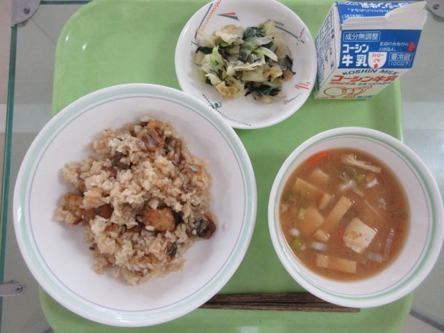 さんまご飯・キャベツの磯和え・豆腐とえのきの味噌汁・牛乳