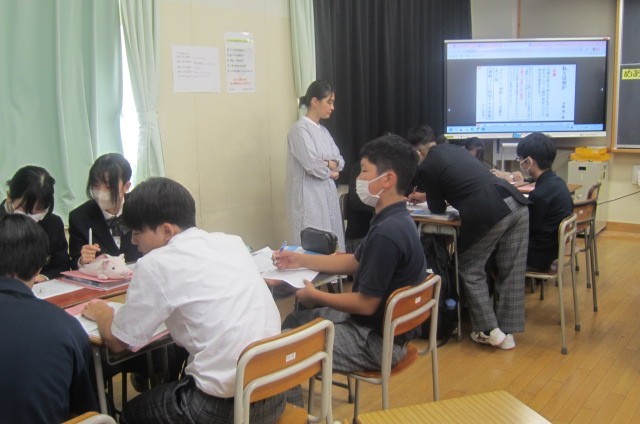 9年生国語の授業 公開日 2025/10/07 更新日 2025/10/07 できごと 10月7日(火) 9年生の国語では「私とは何か」という教材をもとに文章の構成を学び、各自が決めた目標に向けて、最終的には学んだことを生かして200字作文が書けるようにする学習計画で授業が進められていました。今日は、作文例を読んで誤りを指摘し、作文を書く上で気をつけるべきことをまとめる活動を班で意見を出し合いながら進めていました。友達と考えを出し合いながらの協働的な学習が実践されています。