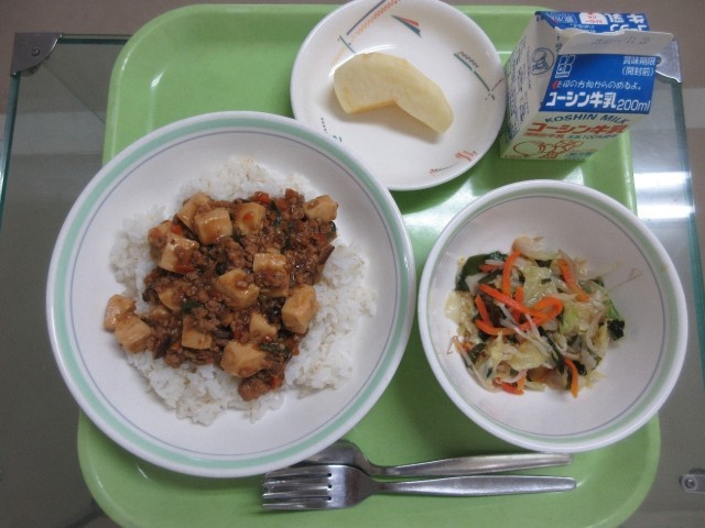 麻婆豆腐丼・野菜の中華醤油和え・果物(りんご)・牛乳