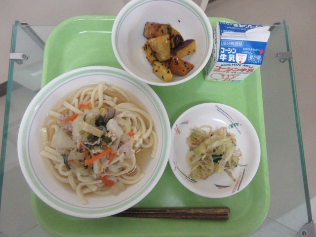 関西風かけわかめうどん・お浸し・大学芋・牛乳