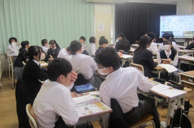 7年生社会の授業 公開日 2025/10/21 更新日 2025/10/21 できごと 10月21日(火) 7年生の社会では、鎌倉時代の歴史を学習していました。今日のテーマは元寇です。資料集の写真や地図を見ながら2回の元の襲来について、先生のお話に、時々周囲の人との意見交換も入れながら、考えていきました。自分が防塁を登るのだったら、自分が船の製造を命令されたのだったらと、自分に置き換えて考えられるように、進められていました。
