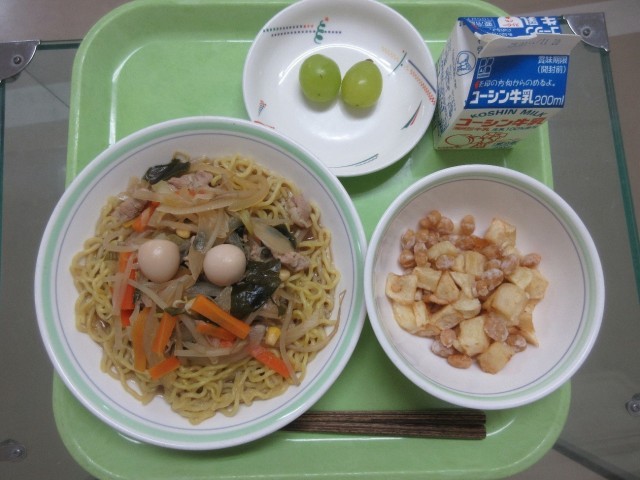 五目ラーメン・大豆とポテトのガーリックフライ・果物(シャインマスカット)・牛乳