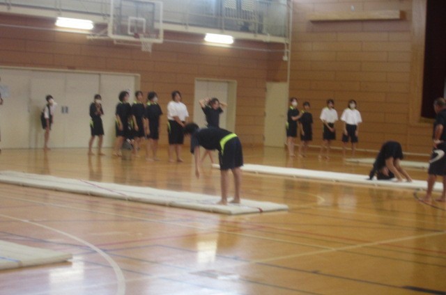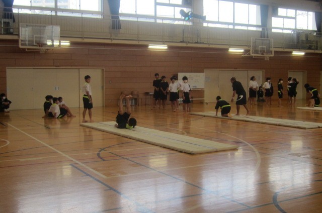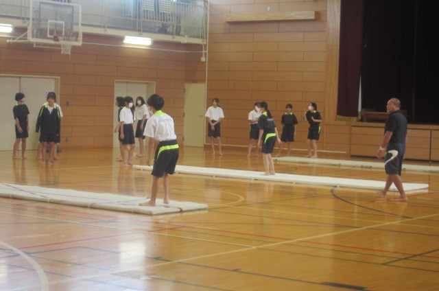 7年生マット運動の授業 公開日 2025/10/27 更新日 2025/10/27 できごと 10月27日(月) 7年生の体育の授業ではマット運動を行っていました。伸脚後転をポイントを確かめながら練習していました。脚を伸ばしたままスッと立ち上がれるときれいに見えます。上手に演技できた生徒には拍手が送られていました。