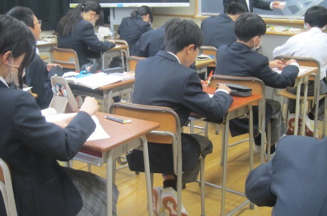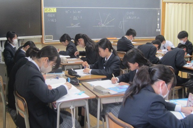 105度と75度の作図を全体で確認した後、今まで学習した様々な作図方法をグループで確認し合いながらプリントの問題に取り組みました。最初の方に学習した回転移動などは忘れている生徒が多く、友達同士で教え合っていました。「2点から等しい距離にある」といった条件が作図方法に結びつくと今度のテストでも高得点が取れそうです。