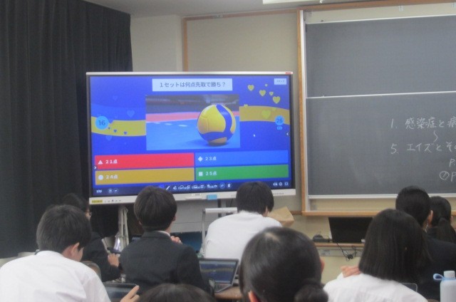 9年生保健の授業 公開日 2025/11/07 更新日 2025/11/07 できごと 11月7日(金) 9年生の保健体育の授業です。来週は定期考査で保健体育のテストもあります。今日はテスト範囲の内容をKAHOOT使ってクイズ形式で復習しました。水泳、バレーボール、保健の感染症の内容それぞれで先生のつくった問題を解いていきました。後半は班で相談して逆に問題を作成しました。どんなところが出題されるか考えながら学習するのは、知識の定着に効果的です。