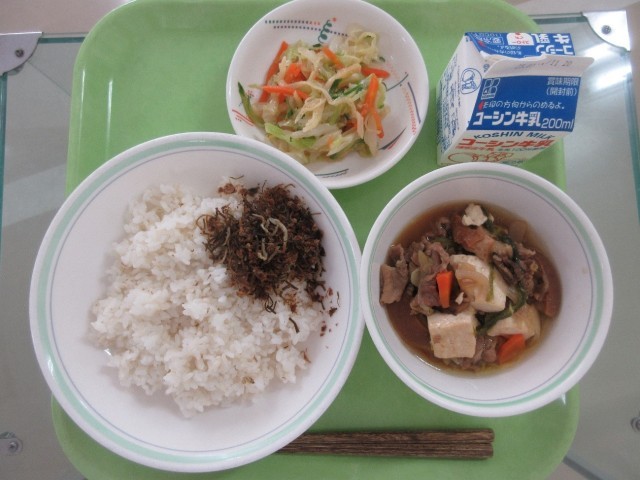 ご飯・骨太ふりかけ・すき焼き風肉豆腐・カミカミサラダ・牛乳