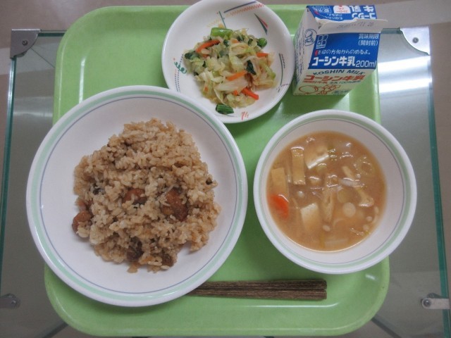 かつお飯・お浸し・油揚げとえのきの味噌汁・牛乳