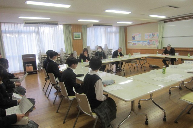 今年度4回目のコミュニティ・スクール委員会を開催しました。今回は生徒会本部役員に来てもらい、活動の内容を報告して委員さんからご助言をいただきました。意見箱での意見募集では、委員さんから「例えば今回はこんな内容の意見を募集します」と呼びかけをして意見を出しやすくしてはといったアドバイスをいただきました。また、あいさつの活性化の取組では、過去にはPTAや地域の方が一緒にあいさつ運動をしたこともあったことを教えてもらいました。地域に支援してもらいたいことがあれば話し合っておいて伝えてくださいと声をかけていただきました。熟議では「めざす生徒像」について協議していただきました。「違いを受け入れること」「他者を敬い大切にすること」「相手の気持ちを考えること」「あいさつができること」など育てていきたい生徒の資質について意見を出していただきました。